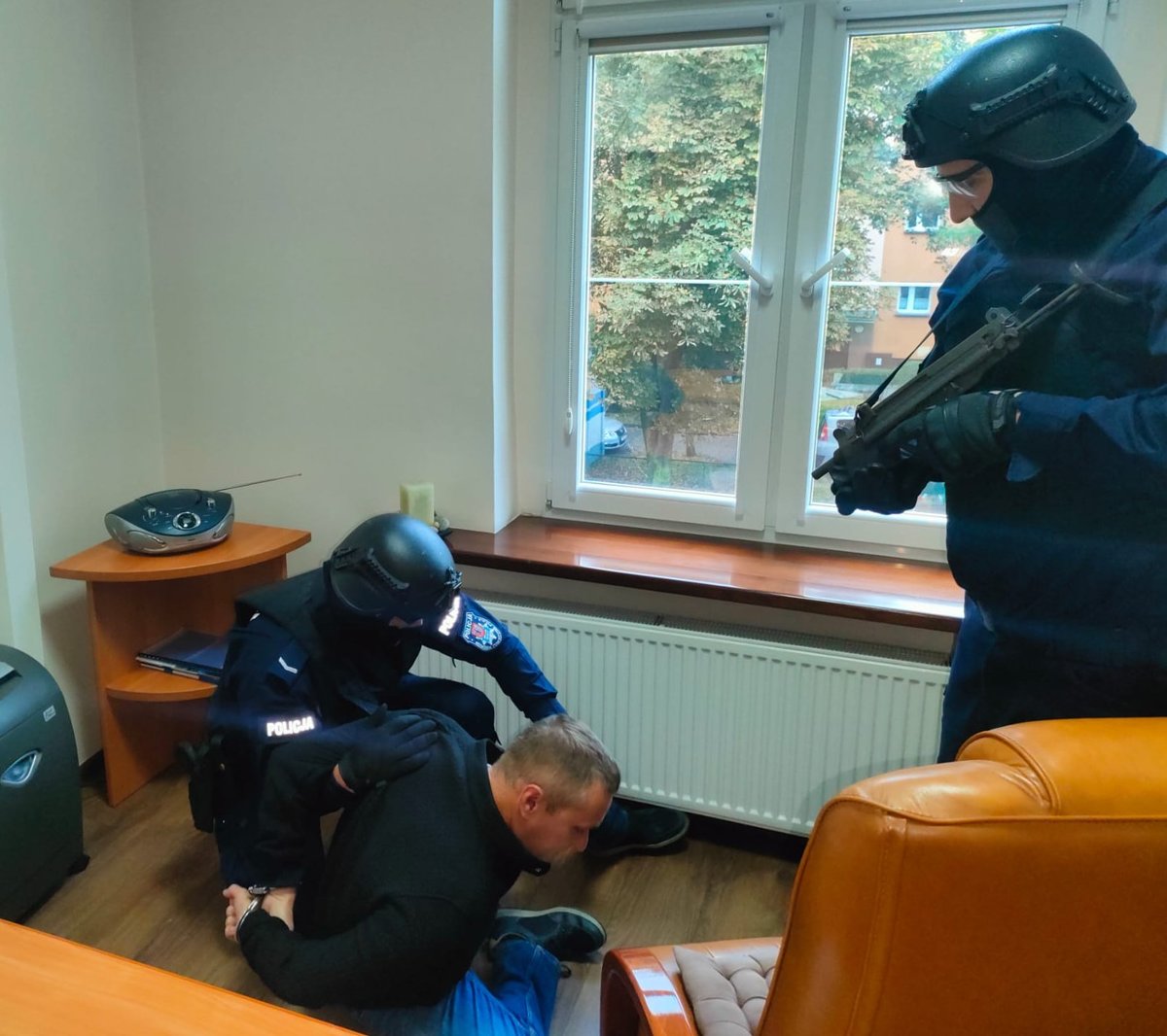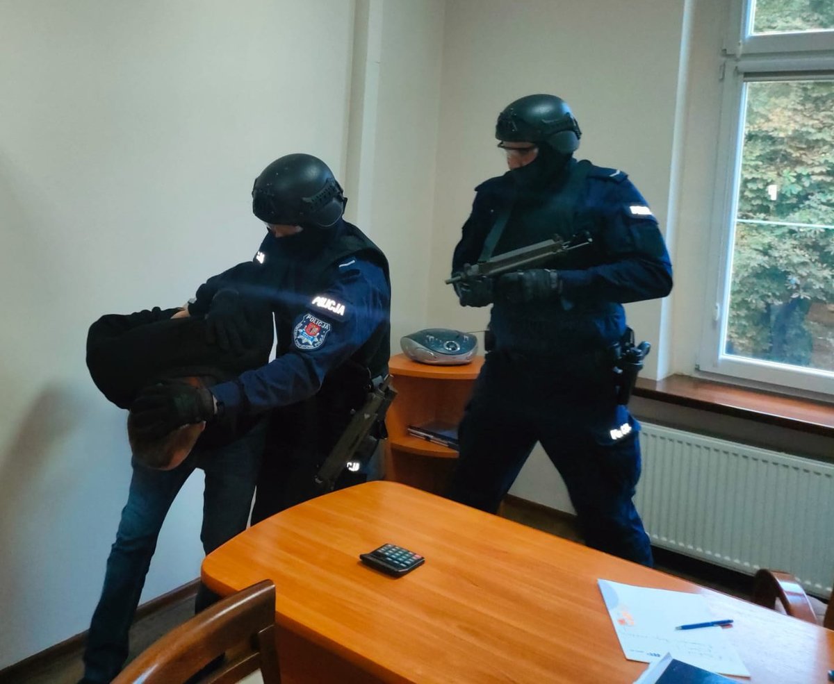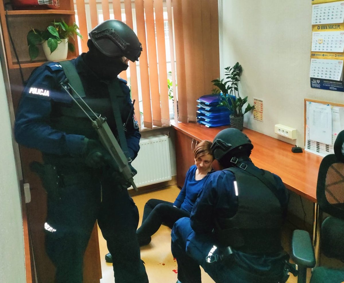 Do budynku urzędu skierowani zostali policyjny negocjator oraz funkcjonariusze Samodzielnego Pododdziału Kontrterrorystycznego Policji. Na miejsce zdarzenia przybyły również kolejne patrole, które wyznaczyły strefy bezpieczeństwa oraz zapewniły udrożnienie dróg dojazdowych do budynku. Zakładnik został odbity z rąk przestępcy, agresor zatrzymany, a reszta pracowników ewakuowana.