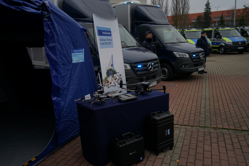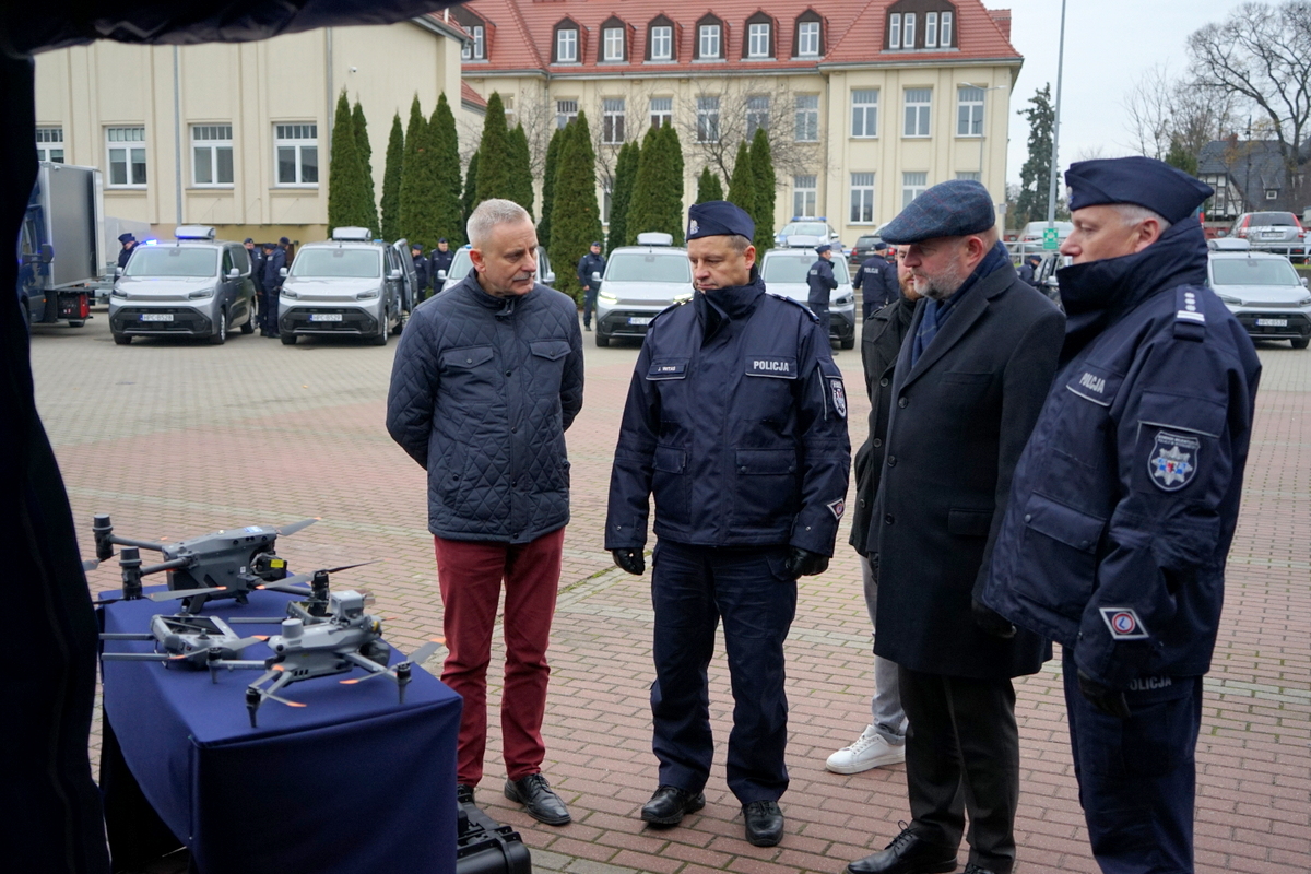 Nowe policyjne auta oraz bezzałogowe statki powietrzne – drony, to sprzęt o wartości 4 285 tys. złotych, którego zakup sfinansowano dzięki wsparciu z programu „Fundusze Europejskie dla Kujaw i Pomorza 2021-2027” w kwocie 2 785 tys. złotych.