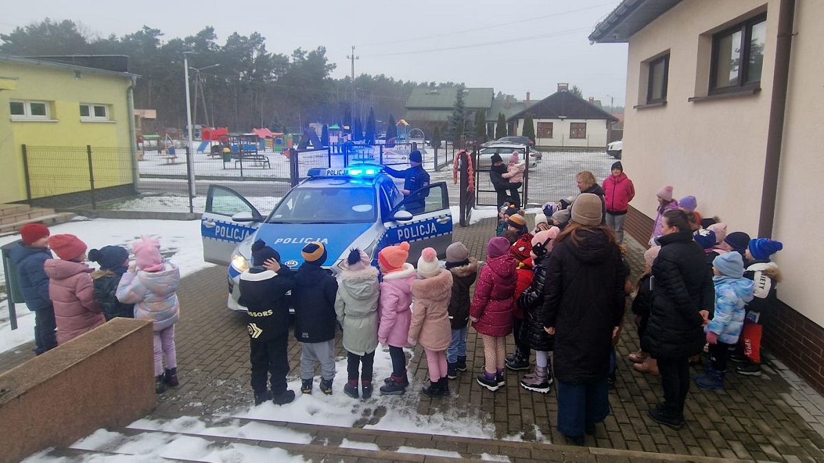 Funkcjonariusze z nakielskiej „drogówki" przypomnieli dzieciom, jak prawidłowo zachować się w rejonie przejść dla pieszych i dlaczego w okresie zimowym trzeba jeszcze bardziej zwiększyć czujność podczas przechodzenia na drugą stronę ulicy z uwagi na możliwość wystąpienia oblodzenia na drodze, co znacząco wydłuża drogę hamowania samochodów.