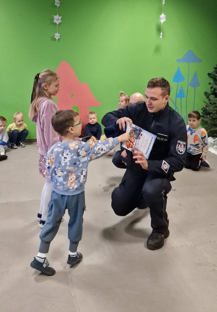 Następnie przyszedł czas na rozmowę. Policjanci poruszyli wiele ważnych tematów związanych z bezpieczeństwem najmłodszych oraz nadchodzącymi feriami. Mundurowi opowiedzieli w jaki sposób korzystać z numerów alarmowych w przypadku konieczności wezwania pomocy. Dzieci dowiedziały się, dlaczego wchodzenie na zamarznięte akweny może być niebezpieczne oraz posłuchały o innych zagrożeniach związanych z zimowym wypoczynkiem.