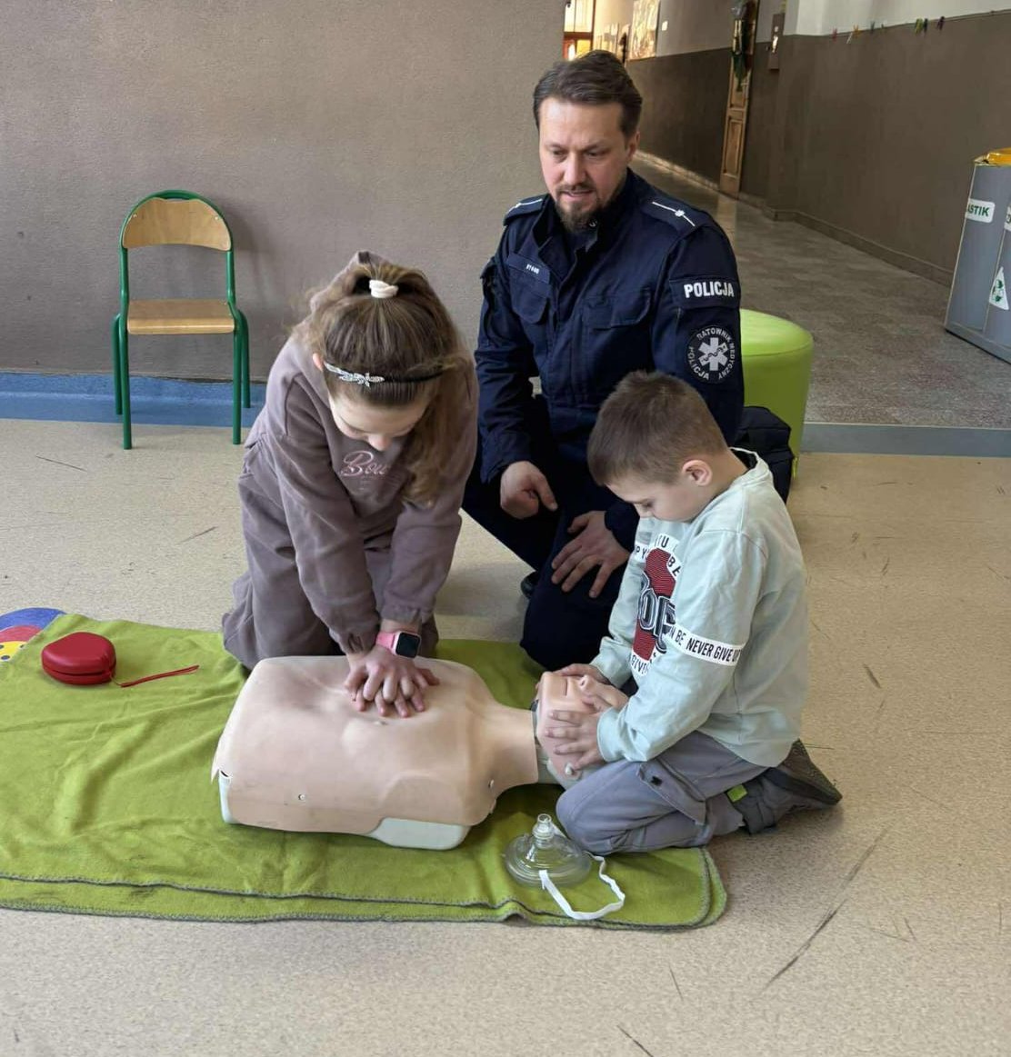Oprócz rozmowy z policjantem dzieci miały możliwość z praktycznej strony poznać, jak prawidłowo udzielić pierwszej pomocy osobie potrzebującej. Funkcjonariusz przestrzegał jednak najmłodszych, że każdorazowo w przypadku konieczności udzielenia pomocy powinni oni zadzwonić na numer alarmowy 112.