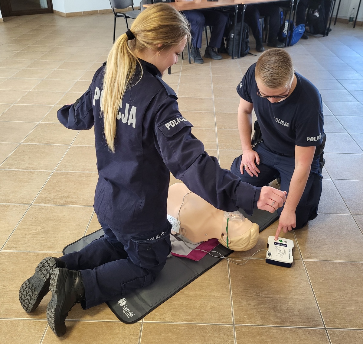 Mundurowi doskonalili praktyczne umiejętności udzielania pierwszej pomocy w przypadkach m.in. zadławienia czy nagłego zatrzymania krążenia oraz szkolili się z zakresu taktyk i technik interwencji, w tym bezpiecznego wyciągania osób zatrzymanych z pojazdów w przypadku stawiania biernego oporu.