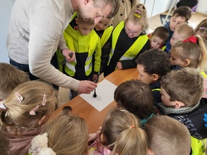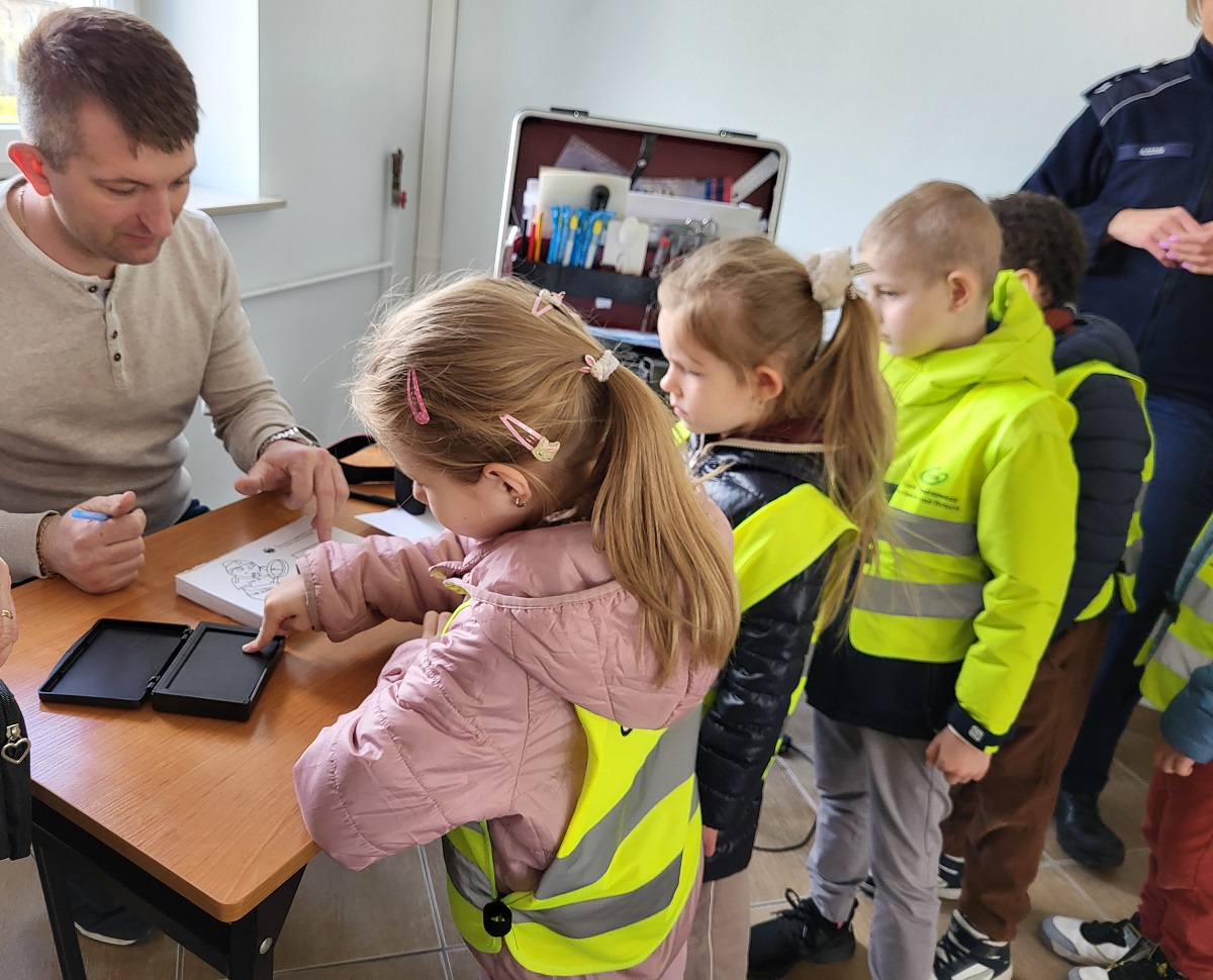 Na koniec policyjny technik kryminalistyki w przystępny dla dzieci sposób opowiedział o swojej pracy oraz wyjaśnił, dlaczego i w jaki sposób stróże prawa zbierają odciski palców na miejscu zdarzenia. Przedszkolaki również miały możliwość wykonania swoich odbitek palców, z czego chętnie skorzystały.